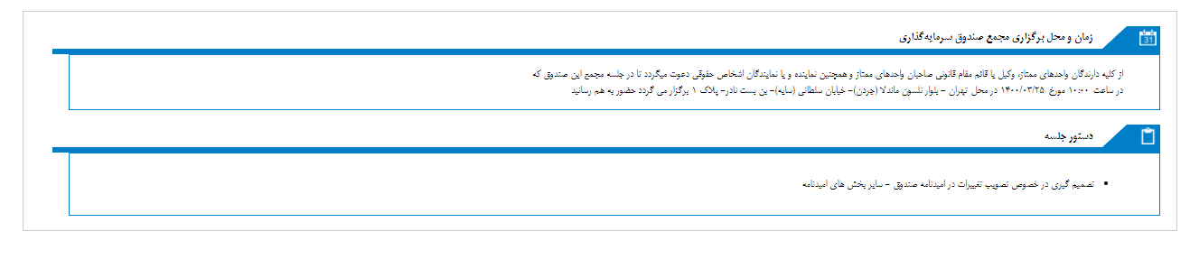 آگهی دعوت به مجمع صندوق سرمایه گذاری (اختصاصي بازارگرداني لاجورد دماوند) منتشر شد.