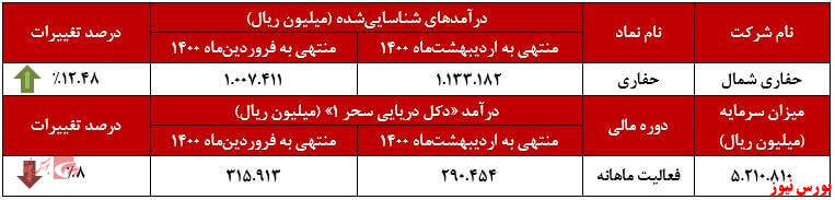 بر پایه این گزارش، میزان درآمدهای حاصلشده حفاری شمال در اردیبهشتماه سال جاری نسبت به ماه گذشته ۱۲.۴۸ درصد افزایش را در پی داشته و در مقایسه با دوره مشابه سال گذشته نیز همانطور که گفته شد ۲۵۰ درصد رشد را به همراه داشته، همچنین بیشترین میزان درآمد ثبتشده در حوزه «دکل دریایی سحر ۱» با ۲۹۰.۴۵۴ میلیون ریال بوده و در رتبه بعدی نیز بخش «دکل دریایی سحر ۲» با ۲۵۳.۶۵۶ میلیون ریال حضور دارد.