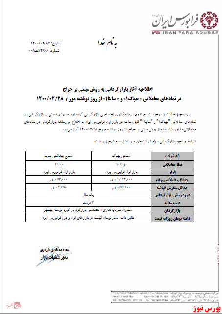 آغاز بازارگردانی هر سه نماد، از فردا ۲۸ تیرماه ۱۴۰۰ است و در نمادهای معاملاتی "بهپاک" و "ساینا" دوره بازارگردانی به مدت یک سال درنظر گرفته شده است.