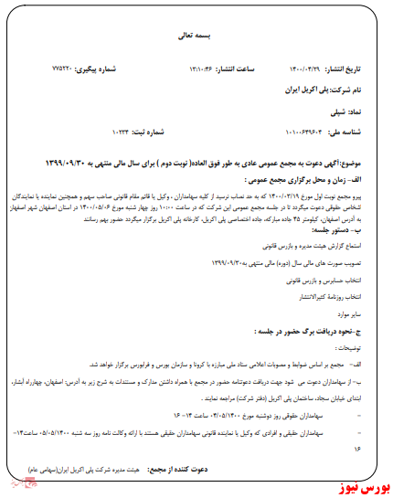 مجمع عمومی شرکت پلیاکریل ایران در تاریخ ۱۴۰۰/۰۵/۰۶برگزار خواهد شد.