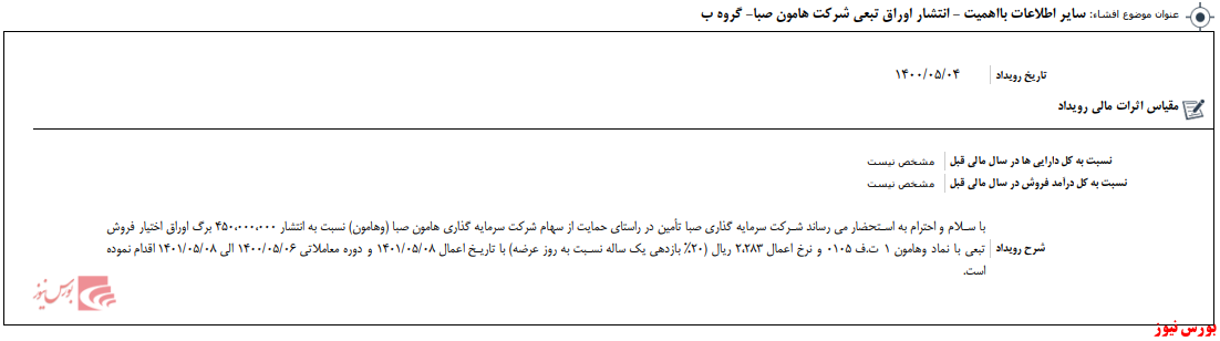 شرکت سرمایه گذاری صبا تامین اوراق تبعی شرکت سرمایه گذاری هامون صبا را منتشر می کند.