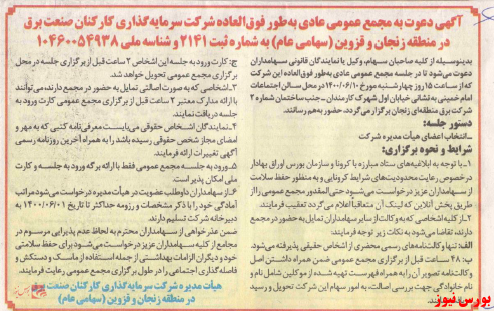 مجمع عمومی فوق العاده شرکت سرمایه گذاری کارکنان صنعت برق در منطقه زنجان و قزوین در تاریخ ۱۴۰۰/۰۶/۱۰ برگزار میشود.