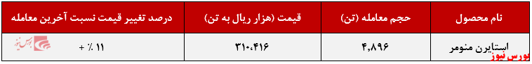 نرخ میانگین معاملات این محصول در هفته گذشته به ۳۱۰,۴۱۶ هزار ریال در هر تن رسیده، همانطور که مشاهده میکنیم تمامی استایرن منومر ارائهشده در هفته گذشته مورد معامله قرارگرفته است.