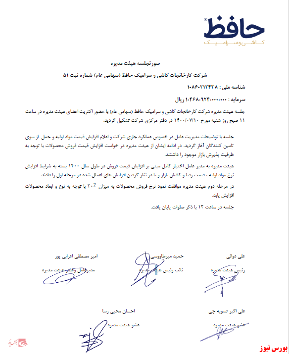 شرکت کارخانجات کاشی و سرامیک حافظ مجوز تغییر بیش از ۱۰ درصد در نرخ فروش محصولات را دریافت کرد.