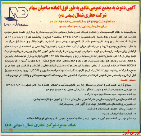 بر این اساس، این شرکت اعلام کرد، از کلیه سهامداران، وکیل یا قائم مقام قانونی صاحب سهم و همچنین نماینده یا نمایندگان اشخاص حقوقی دعوت می شود تا در جلسه مجمع عمومی این شرکت که در ساعت ۰۹:۰۰ روز پنج شنبه مورخ ۱۴۰۰/۰۸/۰۶ در استان تهران، شهر تهران به آدرس تهران، خیابان ولیعصر، بالاتر از تقاطع شهید بهشتی، نبش خیابان دل افروز، پلاک ۲۱۲۷ شرکت حفاری شمال حضور بهم رسانند.