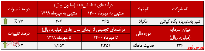 همچنین لازم به ذکر است که شرکت شیر پاستوریزه پگاه گیلان در مهرماه سال جاری درآمدهای شناساییشده خود را طی این دوره یکماهه از فروش محصولات در بازار داخلی به دست آورده است.