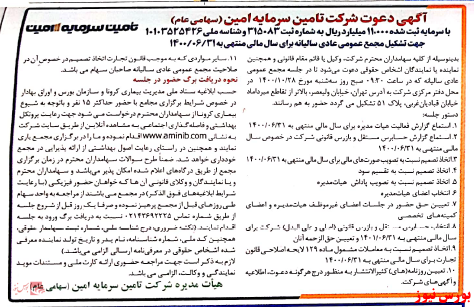 مجمع عمومی عادی سالیانه شرکت تامین سرمایه امین در تاریخ ۱۴۰۰/۱۰/۲۸ برگزار میشود.