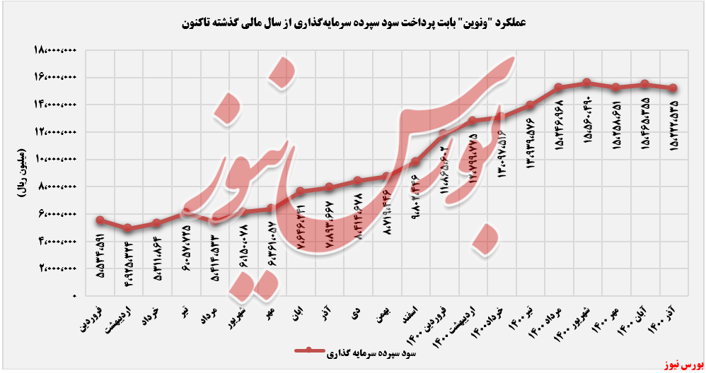 میزان پرداختی "ونوین" بابت سود سپردههای سرمایهگذاری در آذرماه مبلغی بالغبر ۱۵،۲۲۲ میلیارد ریال اعلامشده، از ابتدای سال مالی تا انتهای آذرماه نیز مجموع پرداختیهای این بانک جهت سود سپردههای سرمایهگذاری برابر با ۱۵،۲۲۲ میلیارد ریال بوده، همچنین "ونوین" سرمایه ثبتشده خود را ۳۰,۴۲۵ میلیارد ریال ارائه کرده و در این ماه موفق به ثبت تراز مثبت ۱۶ درصدی شده است.