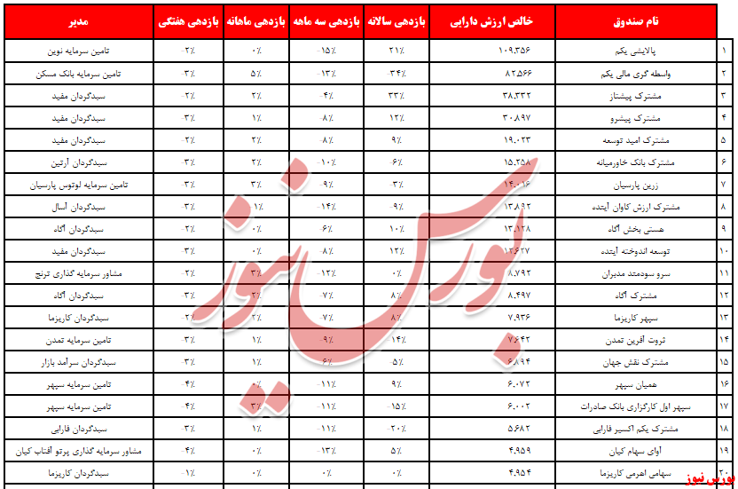 از جمله عناصر اصلی جدول زیر میتوان به آخرین ارزش صندوقها، بازدهی ماهیانه و بازدهی یکساله آنها اشاره کرد.