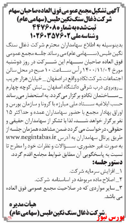 مجمع عمومی فوق العاده زغالسنگ نگین طبس در تاریخ ۱۴۰۰/۱۱/۰۴ برگزار خواهد شد.