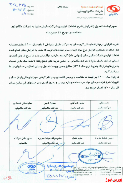 به گزارش بورس نیوز، شرکت مالیبل سایپا از دریافت مجوز تغییر بیش از ۱۰ درصد در نرخ فروش محصولات خبر داد.