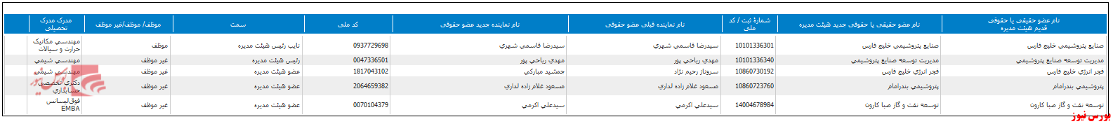 بر این اساس، این شرکت اعلام کرد، باستناد مصوبۀ مجمع عمومی عادی مورخ ۱۳۹۸/۱۲/۰۵ و جلسه هیئت مدیره مورخ ۱۴۰۰/۱۲/۰۴ اسامی اعضای هیئت مدیره و نمایندگان آنها تغییر کرده است.