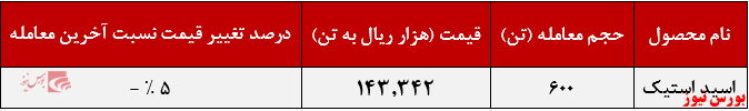 هر تن اسید استیک پتروشیمی فنآوران در هفته گذشته با قیمت ۱۴۳,۳۴۲ هزار ریال در ازای هر تن به فروش رسید که نسبت به هفته گذشته ۵ درصد کاهش نرخ فروش را تجربه کرد، تقاضای ثبتشده برای محصول اسیداستیک "شفن" طی این هفته برابر با ۶۲۴ تن بود که این بخش هم نیز عملکرد مشابهی را همچون هفته گذاشت به ثبت رساند.