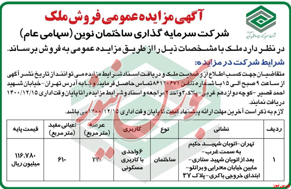 شرکت سرمایه گذاری ساختمان نوین از برگزاری مزایده خبر داد.