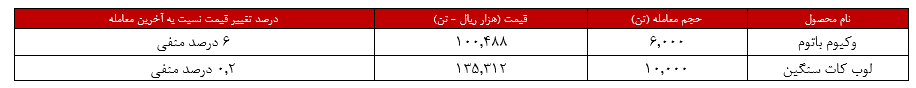 وکیوم باتوم پالایش نفت تهران با قیمت ۱۰۰,۴۸۸ هزار ریال در ازای هر تن به فروش رسید که در مقایسه با آخرین معامله در هفته گذشته ۶ درصد کاهش نرخ را تجربه کرد؛ لازم به ذکر است که این پتروشیمی از این کالا درآمدزایی برابر با ۶۰ میلیارد و ۲۹۲ میلیون تومان را بدست آورد.