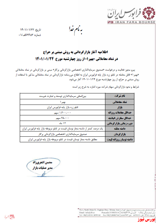 بر اساس این گزارش، از امروز به مدت ۱۲ ماه عملیات بازارگردانی بر نماد معاملاتی شرکت بینالمللی سرمایهگذاری توسعه و تجارت هیرمند در در تابلو زرد بازار پایه فرابورس ایران انجام میشود.