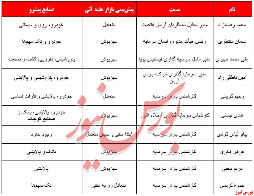 برای پیشبینی این هفته، به سراغ کارشناسان جدیدی رفتهایم تا نظر آنها را درخصوص بازار سرمایه و وضعیت بورس تهران طی این هفته جویا شویم البته برخی کارشناسان هفته گذشته به علت پیشبینی درست نیز در این جدول حضور دارند.