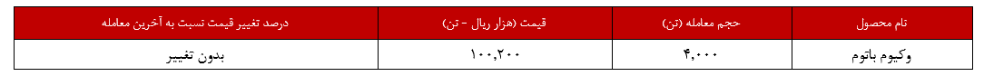قیمت محصول وکیوم باتوم شبریز برابر با ۱۰۰,۲۰۰ هزار ریال بوده و به نسبت آخرین هفته مورد معامله خود بدون تغییر ماند.