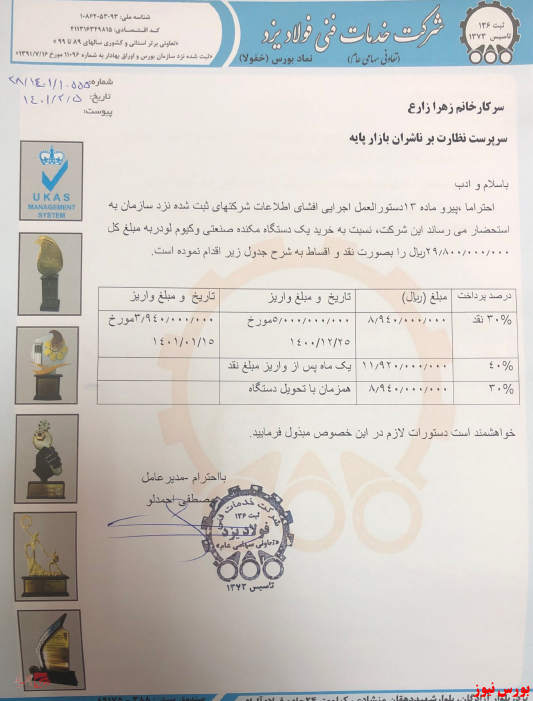 بر این اساس، این شرکت اعلام کرد، نسبت به خرید یک دستگاه مکنده صنعتی وکیوم لودربه مبلغ کل ۲۹.۸۰۰.۰۰۰.۰۰۰ ریال را بصورت نقد و اقساط به شرح پیوست اقدام شده است.