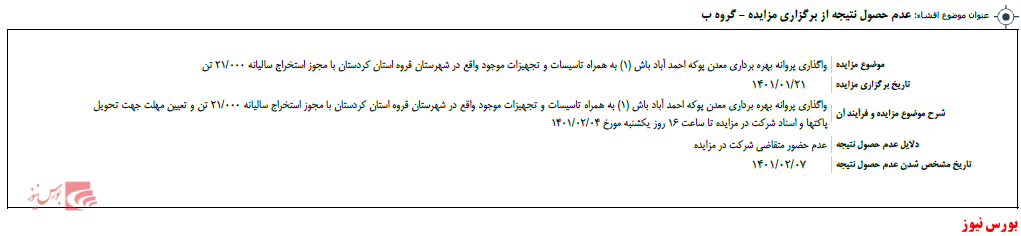 بر این اساس، این شرکت اعلام کرد، مزایده واگذاری پروانه بهره برداری معدن پوکه احمد آباد باش (۱) به همراه تاسیسات و تجهیزات موجود واقع در شهرستان قروه استان کردستان با مجوز استخراج سالیانه ۲۱/۰۰۰ تن برگزار، اما با عدم حضور متقاضی شرکت در مزایده مواجه شد.