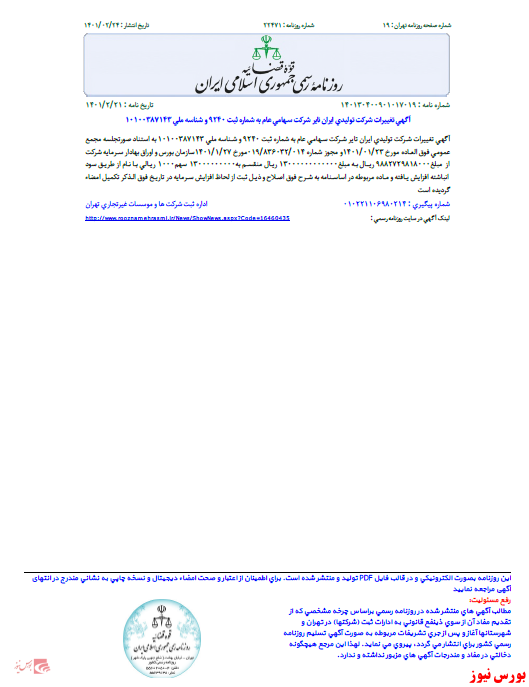 شرکت تولیدی ایران تایر از ثبت افزایش سرمایه خبر داد.