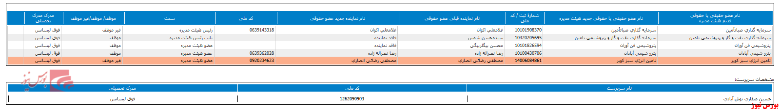 بر این اساس، این شرکت اعلام کرد، باستناد مصوبۀ مجمع عمومی عادی مورخ ۱۴۰۰/۰۳/۱۸ و جلسۀ هیئت مدیرۀ مورخ ۱۴۰۱/۰۳/۰۸ اسامی اعضای هیئت مدیره و نمایندگان آن‌ها تغییر کرده است.