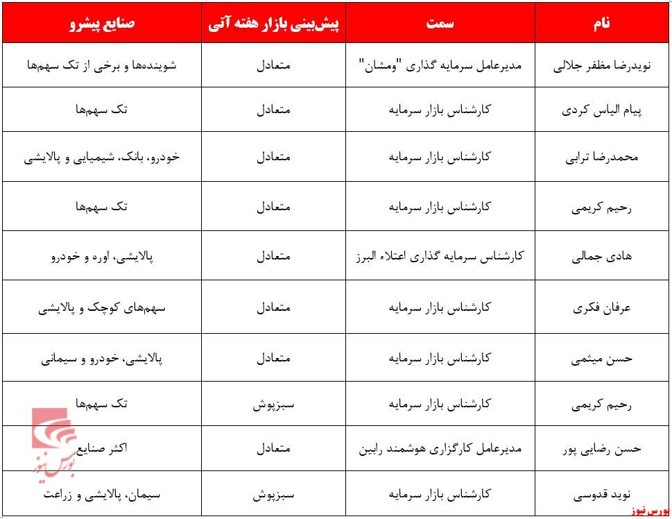 برای پیشبینی این هفته، به سراغ کارشناسان جدیدی رفتهایم تا نظر آنها را در خصوص بازار سرمایه و وضعیت بورس تهران طی این هفته جویا شویم البته برخی کارشناسان هفته گذشته به علت پیشبینی درست نیز در این جدول حضور دارند.