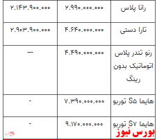 بر اساس این گزارش، قیمت انواع خودروهای تولید شده توسط شرکتهای خودروساز ایرانی در بیست و دوم تیرماه به شرح زیر است: