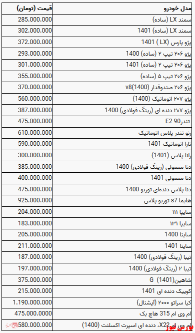 بورس نیوز: قیمت برخی از خودروها، امروز در بازار آزاد نسبت به آخرین معاملات دیروز بدون تغییر بوده است.