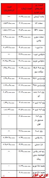 بر اساس این گزارش، قیمت انواع خودروهای تولید شده توسط شرکتهای خودروساز ایرانی در روز جاری به شرح زیر است: