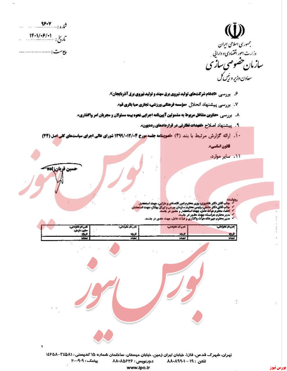 ۱۰. ارائه گزارش مرتبط با بند (۴) "تصویب نامه جلسه مورخ ۱۳۹۹/۱۲/۰۴ شورای عالی اجرای سیاستهای کلی اصل (۴۴) قانون اساسی".
