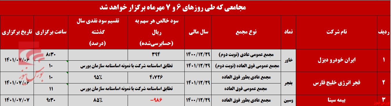 شرکتهایی که در تاریخها ششم و هفتم مهرماه سال ۱۴۰۱ مجمع خود را برگزار میکنند شامل شرکتهای ایرانخودرو دیزل (نوبت دوم)، فجر انرژی خلیجفارس، بیمه سینا میشود.