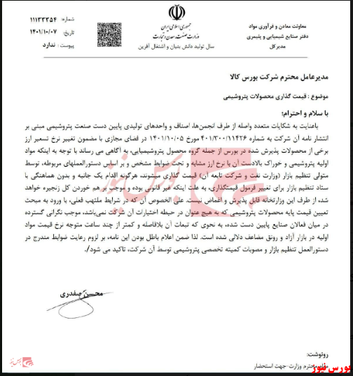 تعیین قیمت پایه محصولات پتروشیمی که به هیچ عنوان در حیطه اختیارات آن شرکت نمیباشد، موجب نگرانی گسترده در میان فعالان صنایع پایین دست شده، به نحوی که تبعات آن بلافاصله و کمتر از چند ساعت متوجه نرخ قیمت مواد اولیه در بازار آزاد و رونق مضاعف دلالی شده است. لذا ضمن اعلام باطل بودن این نامه، بر لزوم رعایت ضوابط مندرج در دستورالعمل تنظیم بازار و مصوبات کمیته تخصصی پتروشیمی توسط آن شرکت، تاکید میشود.