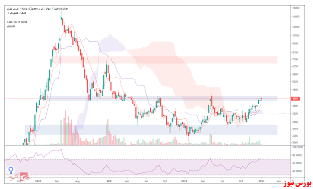سهم در تایم فریم هفتگی توانسته ابر کومو را به سمت بالا بشکند و هماکنون به محدوده مقاومتی (۳۸۵-۴۲۰) تومان رسیده و از جانب دیگر RSI در این تایم فریم به محدوده اشباع خرید واردشده است. مادامیکه سهم بالای ابر کوموی هفتگی باشد دیدگاه بلندمدت ما در این سهم صعودی خواهد بود، ولی برای ادامه رشد لازم است تا سهم بالای محدوده مقاومتی فوقالذکر تثبیت شود.