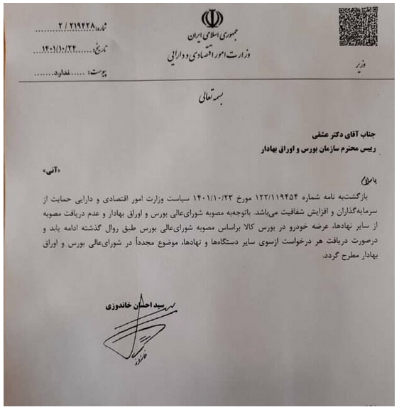 دستور وزیر اقتصاد به ادامه عرضه خودرو در بورس+نامه