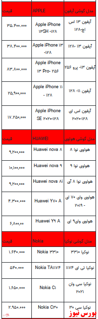 بر اساس این گزارش، آخرین قیمت موبایل و تلفن همراه در روز جاری به شرح زیر است: