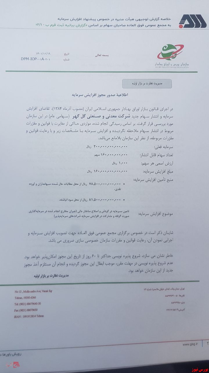 شرکت معدنی و صنعتی گل گهر از انجام افزایش سرمایه خبر داد.