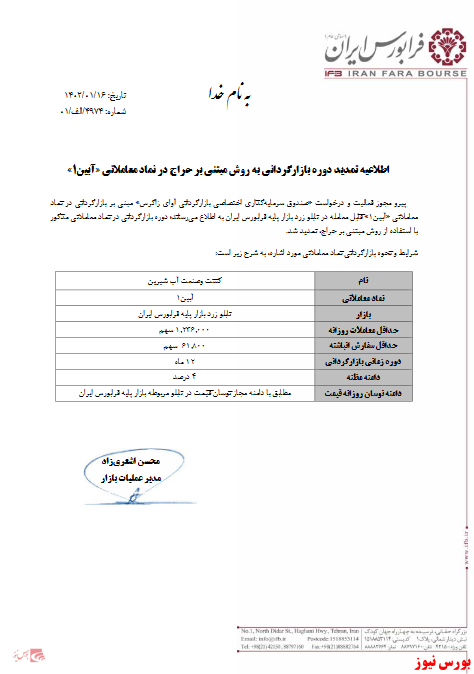 بر این اساس، این شرکت اعلام کرد، بازارگردانی نماد معاملاتی "آبین" با استفاده از روش مبتنی بر حراج تمدید شد.