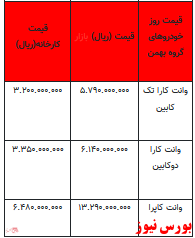 بر اساس این گزارش، قیمت انواع خودرو‌های تولید شده توسط شرکت‌های خودروساز ایرانی به شرح زیر است: