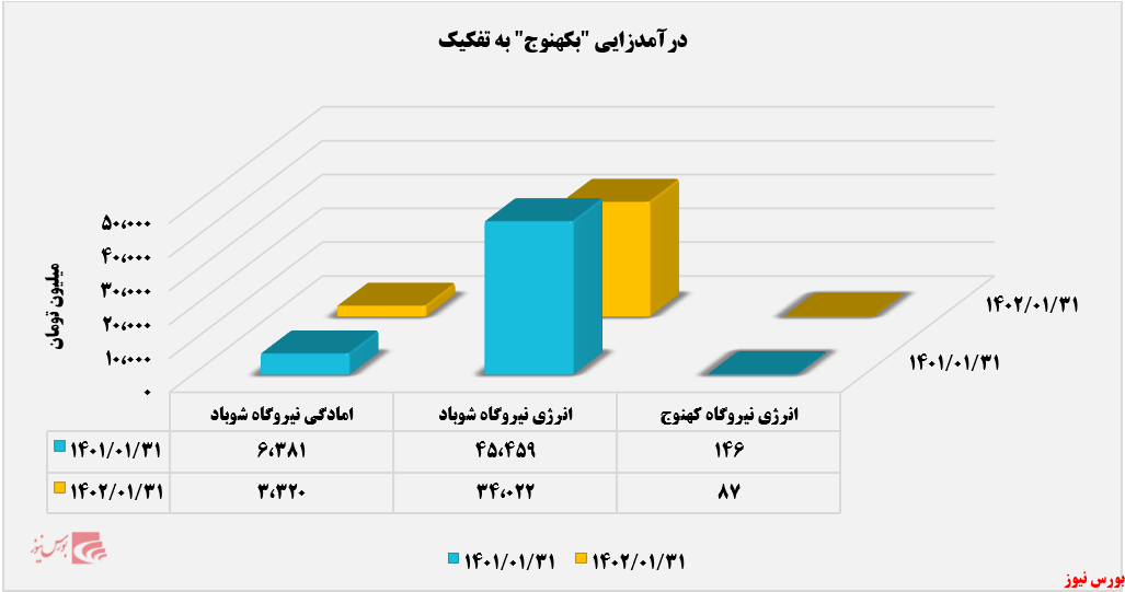 بیشترین درآمدزایی صورت گرفته در این دوره ۳ ماهه متغلق به انرژی نیروگاه شوباد با ۳۴ میلیارد تومان بود که ۹۱ درصد از درآمدزایی "بکهنوج" را به خود اختصاص داد. دیگر درآمدزاییهای به عمل آمده مربوط به آمادگی نیروگاه شوباد و انرژی نیروگاه کهنوج بود. درآمدزایی که از بخش انرژی نیروگاه شوباد در این دوره به دست آمد در مقایسه با دوره مشابه سال گذشته کاهش ۲۵ درصدی را به همراه داشت.