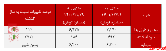 "تجلی" در گزارش صورتوضعیت مالی سالانه خود مجموع داراییهای ثبتشده را برابر با ۷ هزار و ۱۴۰ میلیارد تومان ارائه کرده که رشد ۱۱ درصدی را نسبت به پایان سال مالی گذشته شاهد بود و بیشترین دارایی در اختیار بخش «سرمایهگذاریهای بلند مدت» با ۴ هزارو ۶۴۸ میلیارد تومان بود که نسبت به پایان سال گذشته ۶۸ درصد افزایش را به همراه داشت.