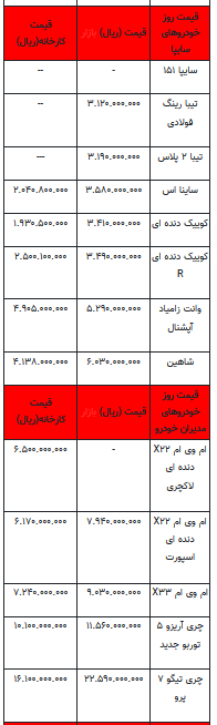 بر اساس این گزارش، قیمت انواع خودروهای تولید شده توسط شرکتهای خودروساز ایرانی به شرح زیر است: