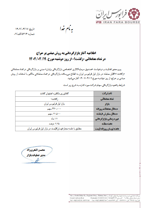 بر این اساس، بازارگردانی نماد معاملاتی "زکشت" با در بازار اول فرابورس انجام خواهد شد.