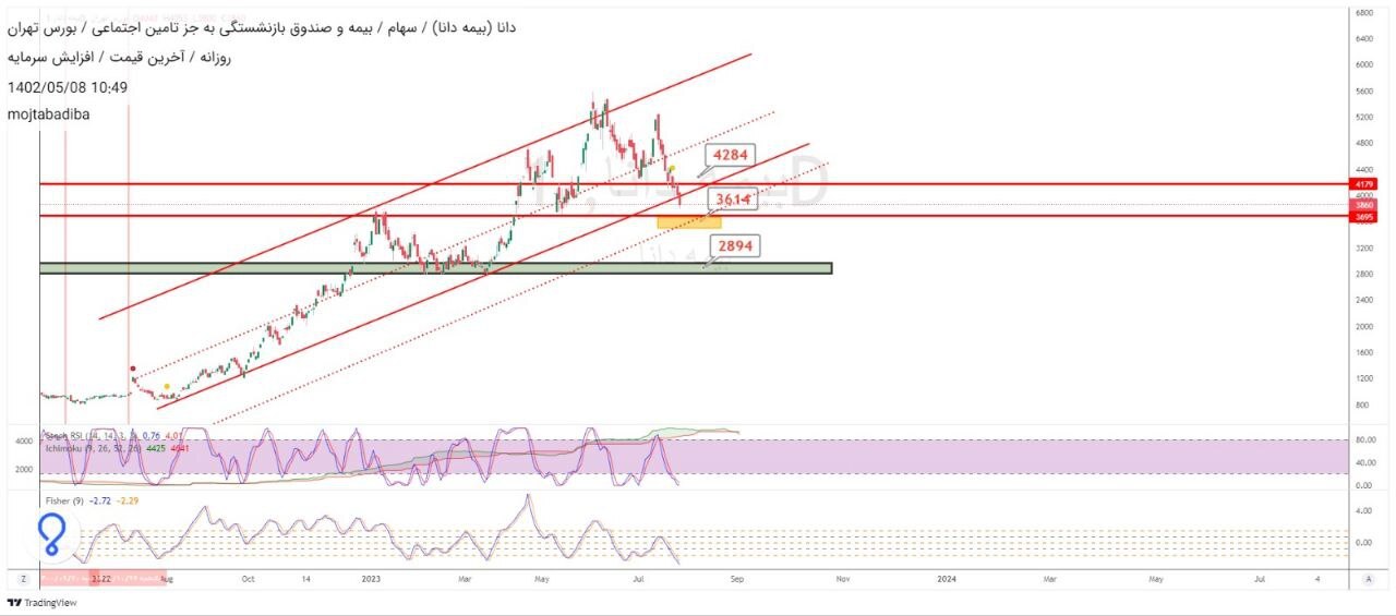 تایم فریم تحلیل روزانه و سهم تحلیل شده بیمه دانا است.