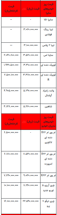 بر اساس این گزارش، قیمت انواع خودروهای تولید شده توسط شرکتهای خودروساز ایرانی به شرح زیر است: