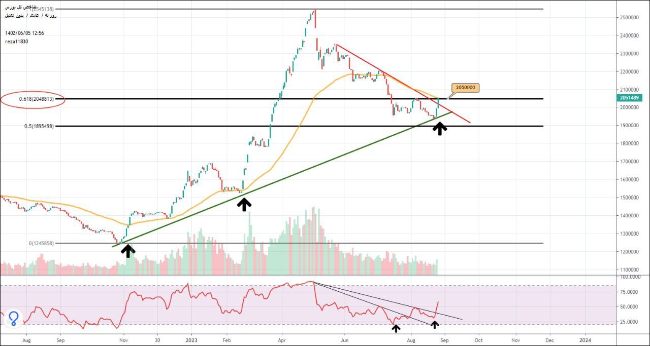 معاملات امروز شاخص را به عدد دقیق ۲۰۵۰۰۰۰ رسانید که سطح تراز ۶۱.۸٪ فیبوناچی و همچنین میانگین متحرک ۵۶ روزه است و لذا این نبرد و درگیری در چندروزه آتی، کاملاً طبیعی خواهد بود.