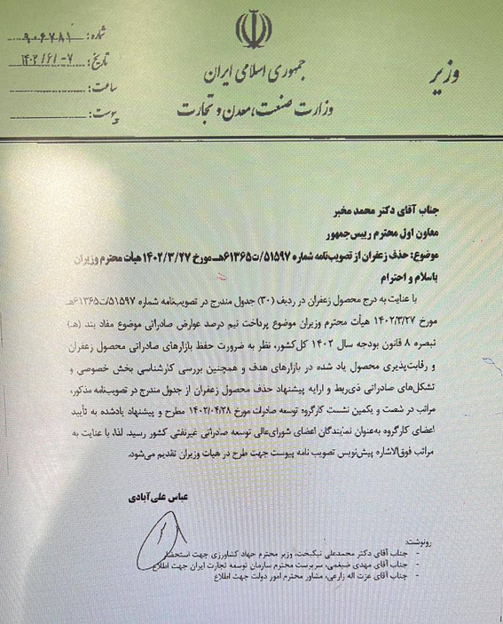 در این نامه آمده است: با عنایت به درج محصول زعفران در ردیف (۳۰) جدول مندرج در تصویب نامه شماره ۵۱۵۹۷ ت ۱۳۶۵ ه مورخ ۱۴۰۲/۳/۲۷ هیئت وزیران موضوع پرداخت نیم درصد عوارض صادراتی موضوع مفاد بند (ه) تبصره ۸ قانون بودجه سال ۱۴۰۲ کل کشور نظر به ضرورت حفظ بازار‌های صادراتی محصول زعفران و رقابت پذیری محصول یاد شده در بازار‌های هدف و همچنین بررسی کارشناسی بخش خصوصی و تشکل‌های صادراتی ذیربط و ارائه پیشنهاد حذف محصول زعفران از جدول مندرج در تصویب نامه مذکور مراتب در شصت و یکمین نشست کارگروه توسعه صادرات مورخ ۱۴۰۲/۰۴/۲۸ مطرح و پیشنهاد یاد شده به تأیید اعضای کارگروه به عنوان نمایندگان اعضای شورای عالی توسعه صادراتی غیرنفتی کشور رسید، لذا با عنایت به مراتب فوق الاشاره پیش نویس تصویب نامه پیوست جهت طرح در هیأت وزیران تقدیم می‌شود.