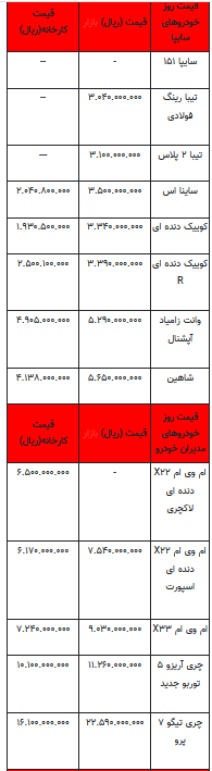 بر اساس این گزارش، قیمت انواع خودروهای تولید شده توسط شرکتهای خودروساز ایرانی به شرح زیر است: