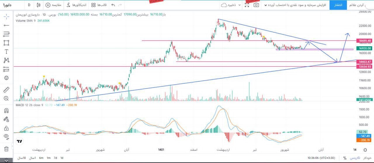 اگر به نمودار دقت کنید، در تایم فریم روزانه در حال کف‌سازی در محدوده قیمتى ١٦٥٠ تا ١٦٨٠ تومان است که می‌تواند بعد از عبور از این محدوده تا مقاومت ١٨٥٠ تومان رشدى را داشته باشد!