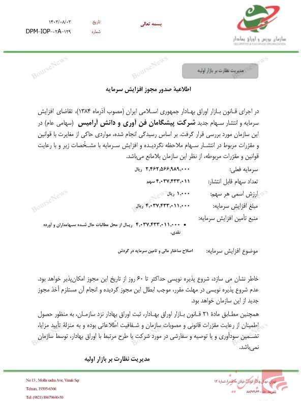 به گزارش بورس نیوز، پس از پیشنهاد هیئت مدیره به مجمع عمومی فوق العاده در خصوص افزایش سرمایه شرکت پیشگامان فن آوری و دانش آرامیس، با اعلام سازمان بورس و اوراق بهادار، مجوز افزایش سرمایه تپسی صادر شد.